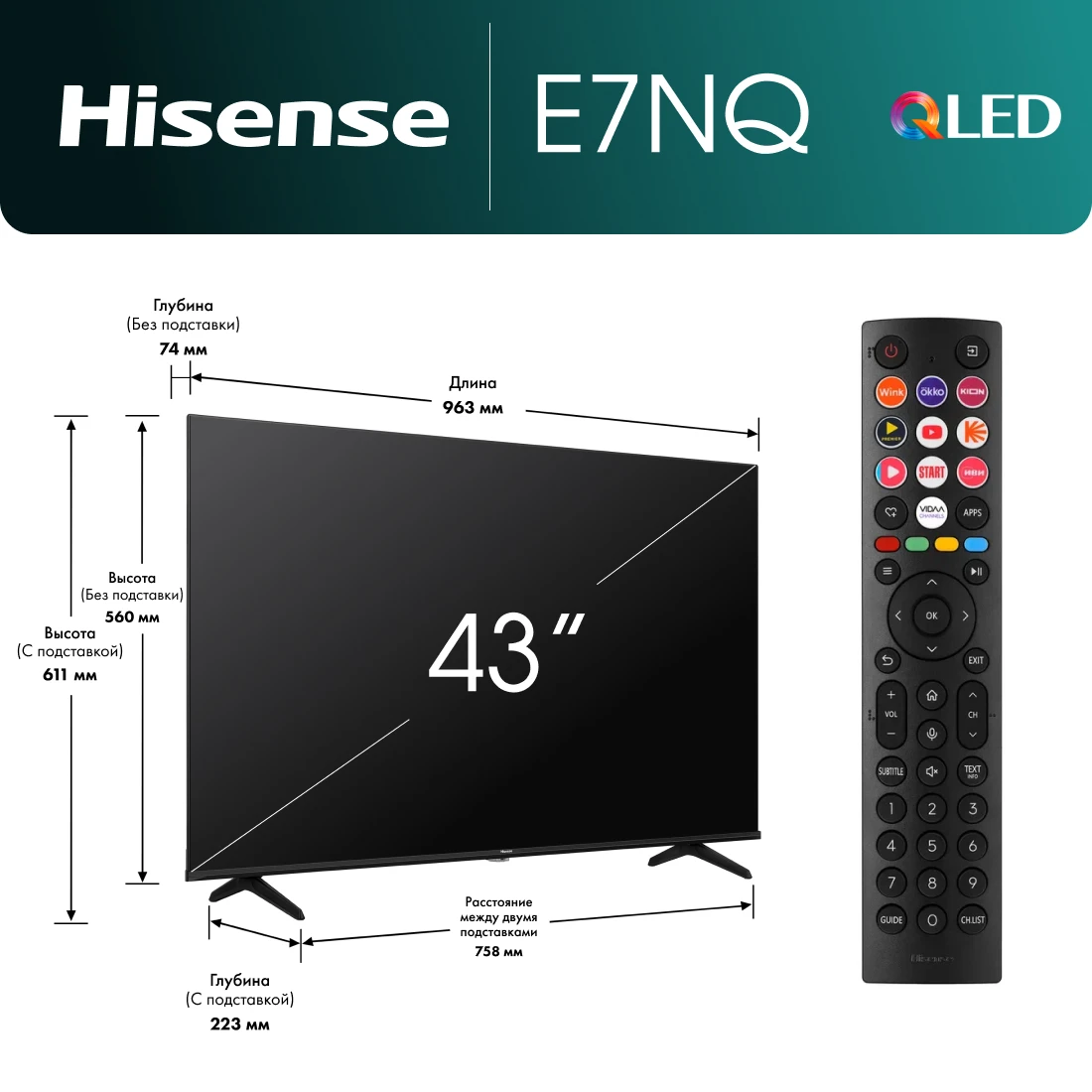 Телевизор Hisense 43E7NQ с экраном диагональю 43 дюйма функционирует под контролем операционной системы Vidaa, которая обеспечивает высокую скорость работы и доступ к популярным приложениям, стриминговым сервисам, другим возможностям умного телевидения. 4К-технология способствует выводу эффектной и качественной картинки с большим числом деталей, цветовых переходов.