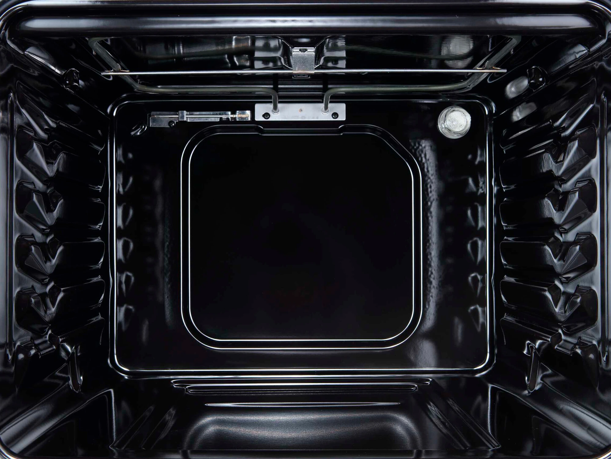 Управление механическое, за него отвечают два поворотных регулятора. Температура устанавливается в диапазоне от 50°С до 250°С. Опорой для противней служат рельефные направляющие. Стенки покрывает эмаль легкой очистки, загрязнения удаляются гидролизным методом. Безопасность обеспечивается системой автоматического отключения. Дверца оснащена двойным стеклом, препятствующим сильному нагреву снаружи.