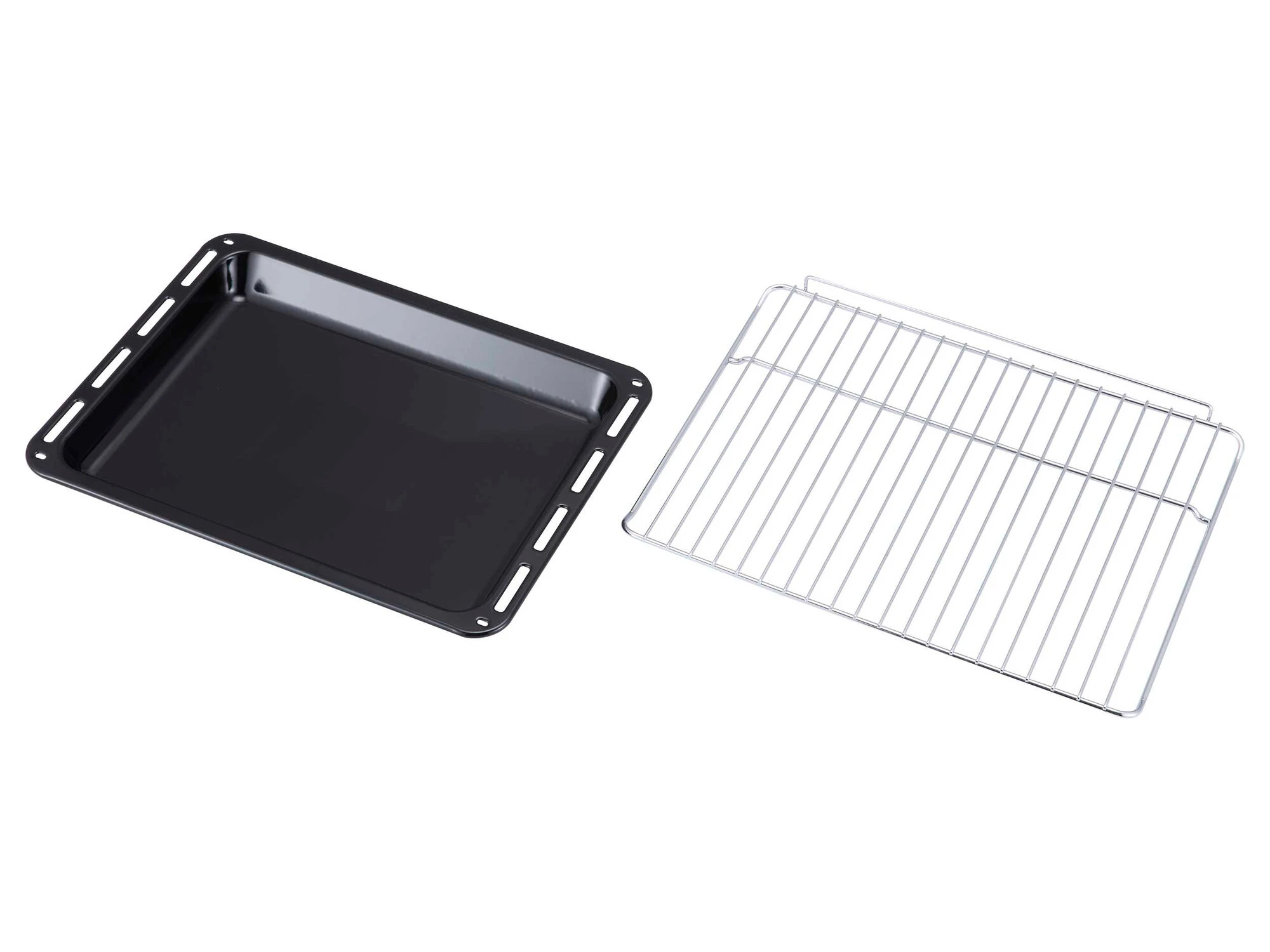 На цифровом дисплее отображаются параметры приготовления блюда. Есть индикатор режима работы и встроенный таймер. В качестве осветительного элемента используется лампа накаливания. Модель оснащена опцией аварийного отключения. Духовой шкаф работает от электрической сети и потребляет 3000 Вт. В комплекте есть противень для выпекания и решетка для гриля.