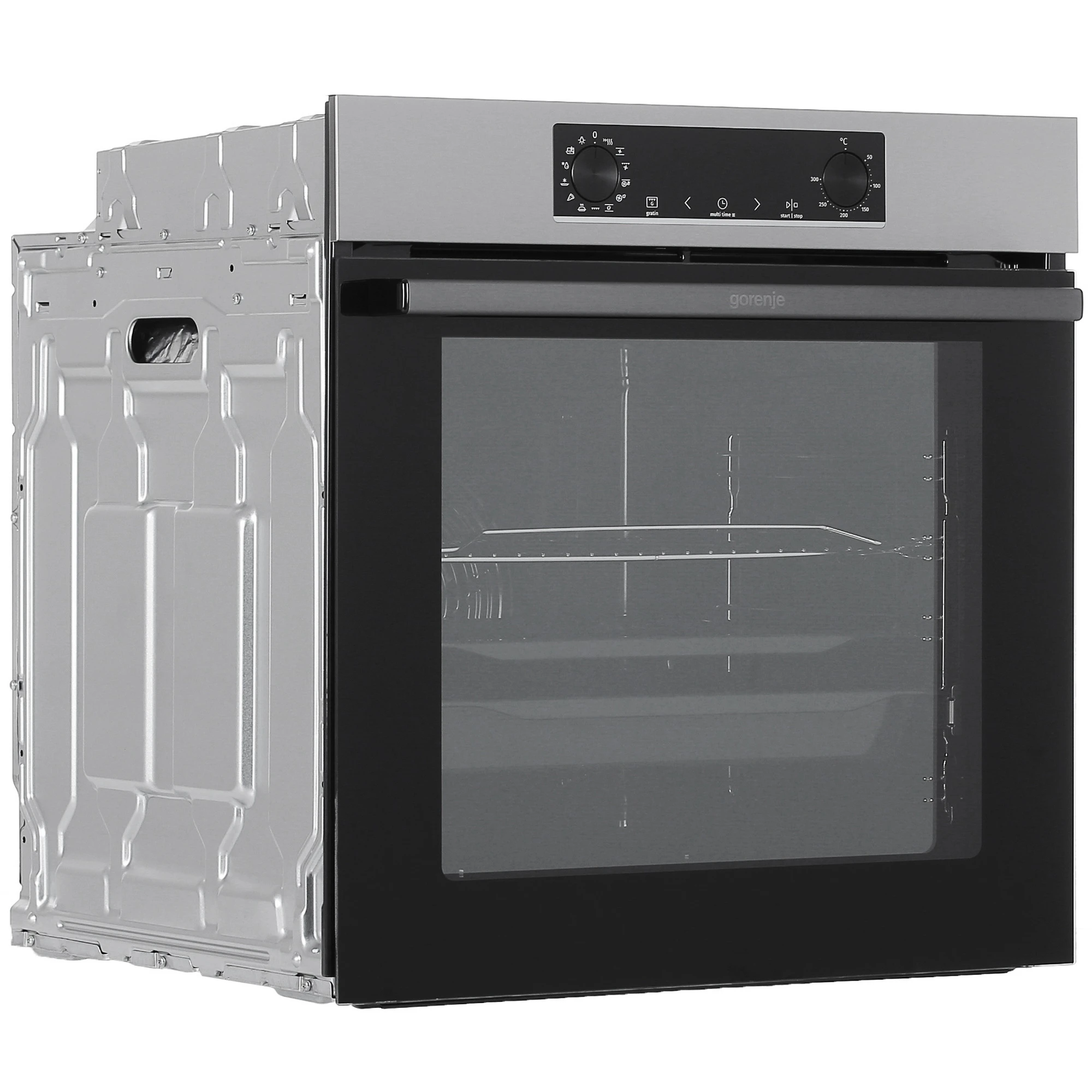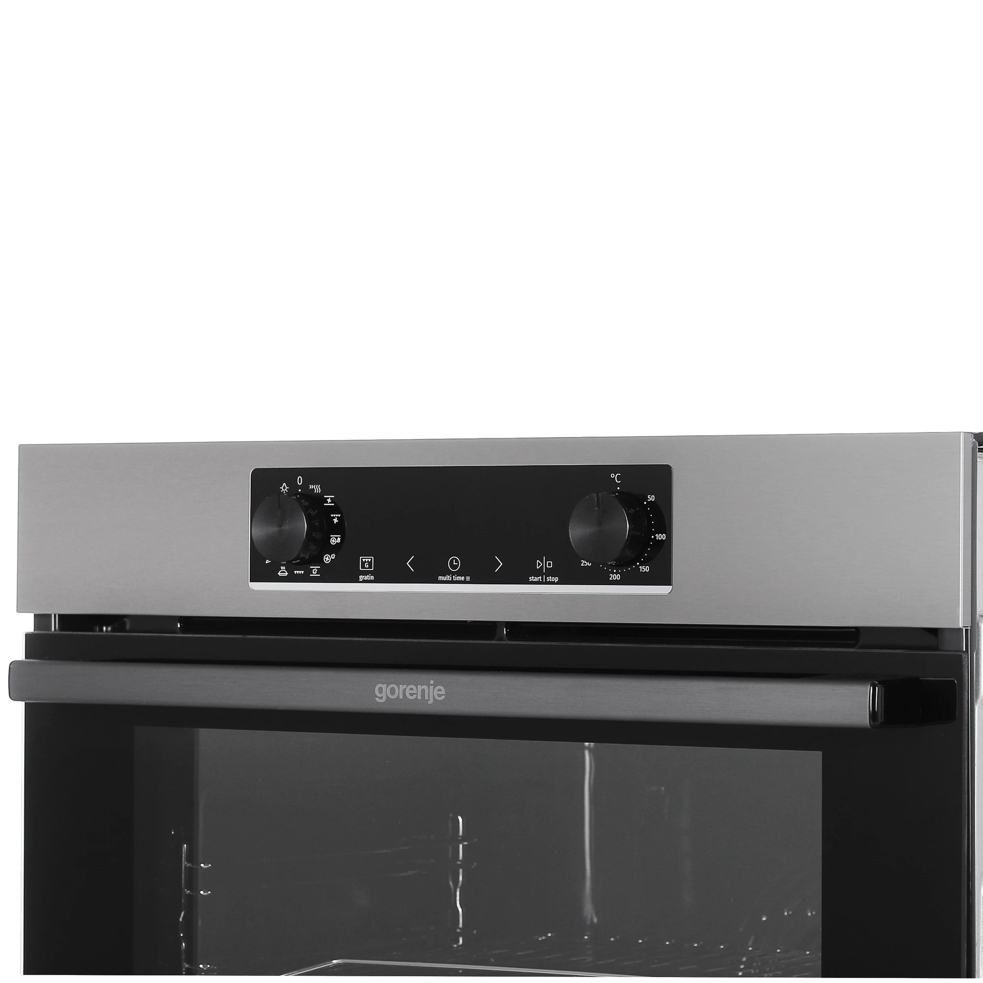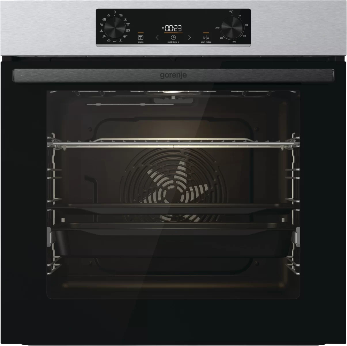 Духовой шкаф Gorenje BOSB6737E06X — это встраиваемая модель в строгом и лаконичном дизайне из коллекции Essential. Внешний вид продуман до мелочей — фасад из светлого оттенка нержавеющей стали, темно-серая ручка, почти сливающаяся с черным матовым корпусом, логотип на несколько тонов темнее, что делает его максимально ненавязчивым и незаметным. Управление осуществляется гибридным способ — есть и сенсорная панель, и поворотные рычаги так же в черном оттенке. Благодаря тому, что они утапливаются в корпус, поверхность выглядит гладкой и однородной, ничего не выбивается из общего ансамбля. Интересно обыгран цвет текста на LED-панели: используется белый и тепло-желтый цвет, перекликающийся с подсветкой внутри духовки. Это создает атмосферу уюта, дополняет спокойный и элегантный дизайн изделия.