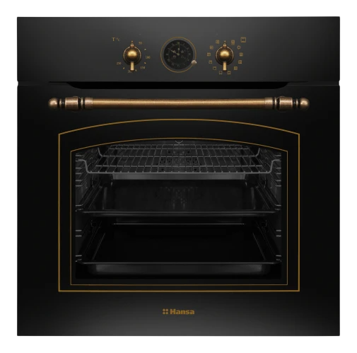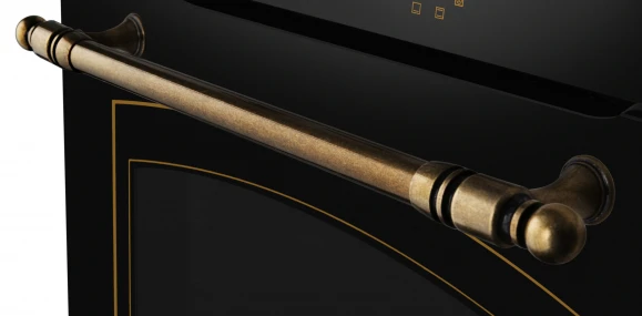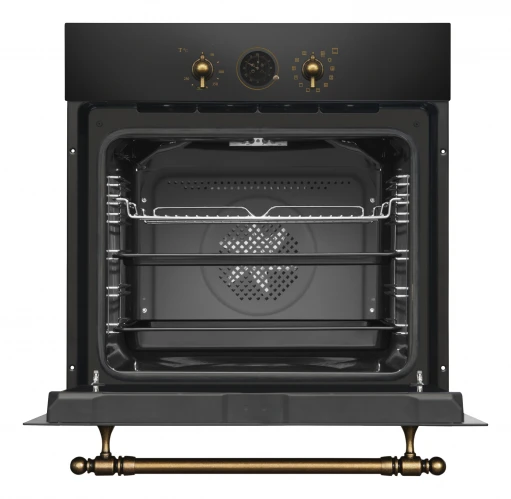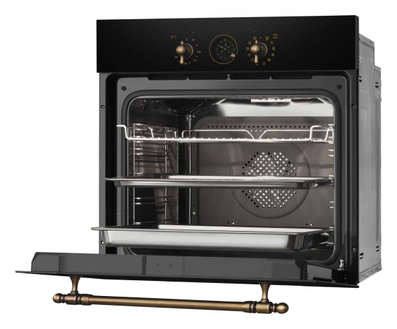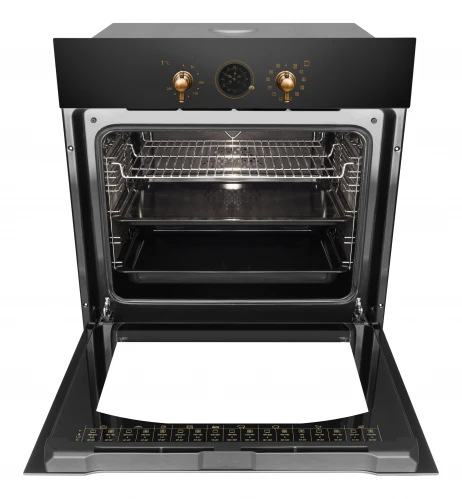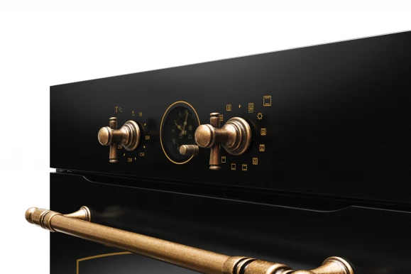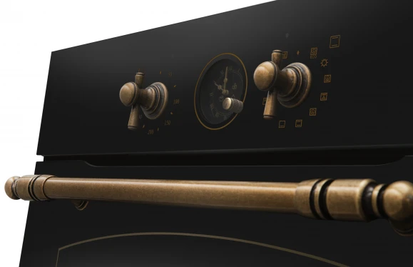 встраиваемая модель объемом 77 л в черном цвете с бронзовыми элементами, сочетающая 11 режимов работы, конвекцию и каталитическую очистку. Прибор оснащен поворотными переключателями, таймером с автоотключением и шестью уровнями установки противней, обеспечивая быстрый нагрев за 4 минуты до 250∘C