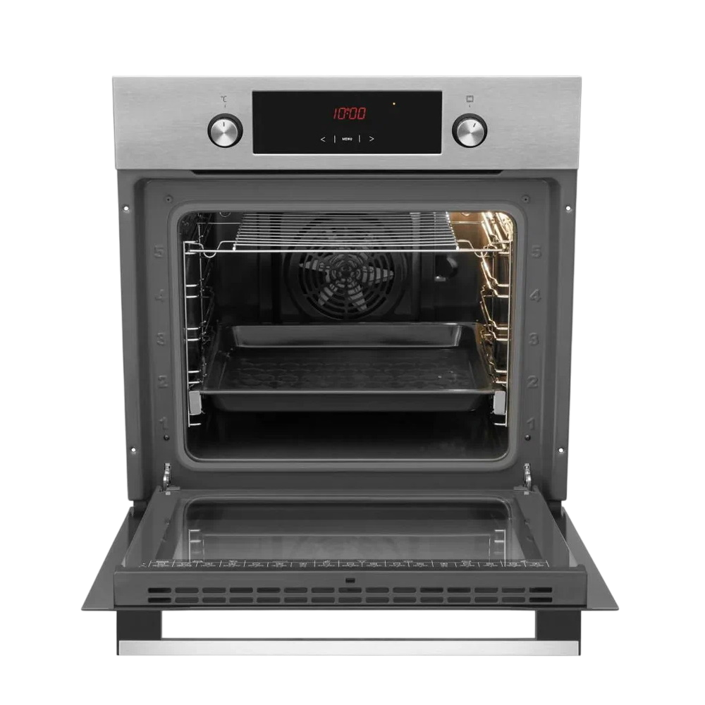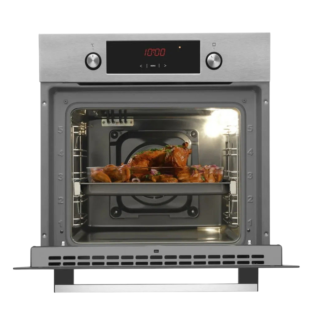 В конструкцию модели включены телескопические направляющие. Откидная дверца имеет двойное остекление, служащее для эффективного сохранения тепла во внутреннем пространстве шкафа. В комплект поставки шкафа входят глубокий противень, решетка и инструкция по эксплуатации. Габаритные размеры шкафа составляют 59.5x59.5x57.5 см. При оформлении дизайна модели были использованы серебристый и черный цвета.