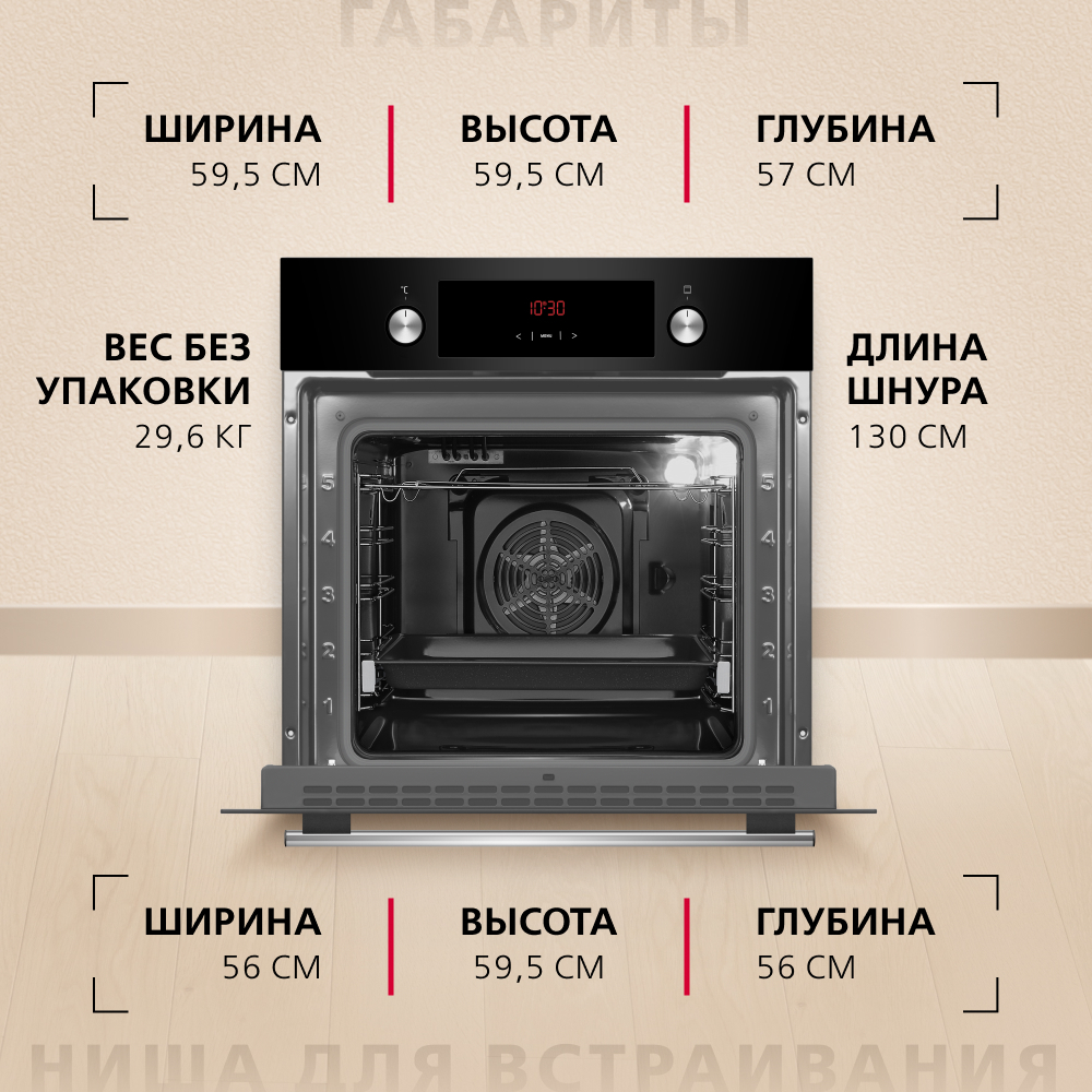 Hansa BOES68441 оборудован дисплеем для точного выбора и отображения настроек. Программируемый таймер приостанавливает нагрев во внутренней камере по окончании заданного временного интервала. Удобно выдвинуть и установить противни позволяют телескопические направляющие. Для подключения к сети предусмотрен 1.3-метровый кабель. Отследить кулинарный процесс без необходимости открывать дверцу можно с помощью галогенной лампы мощностью 25 Вт.