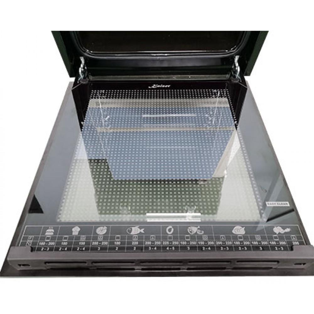 • Панорамное внутреннее стекло дверцы с таблицей рецептов (подсказки по температуре и времени для разных блюд).
