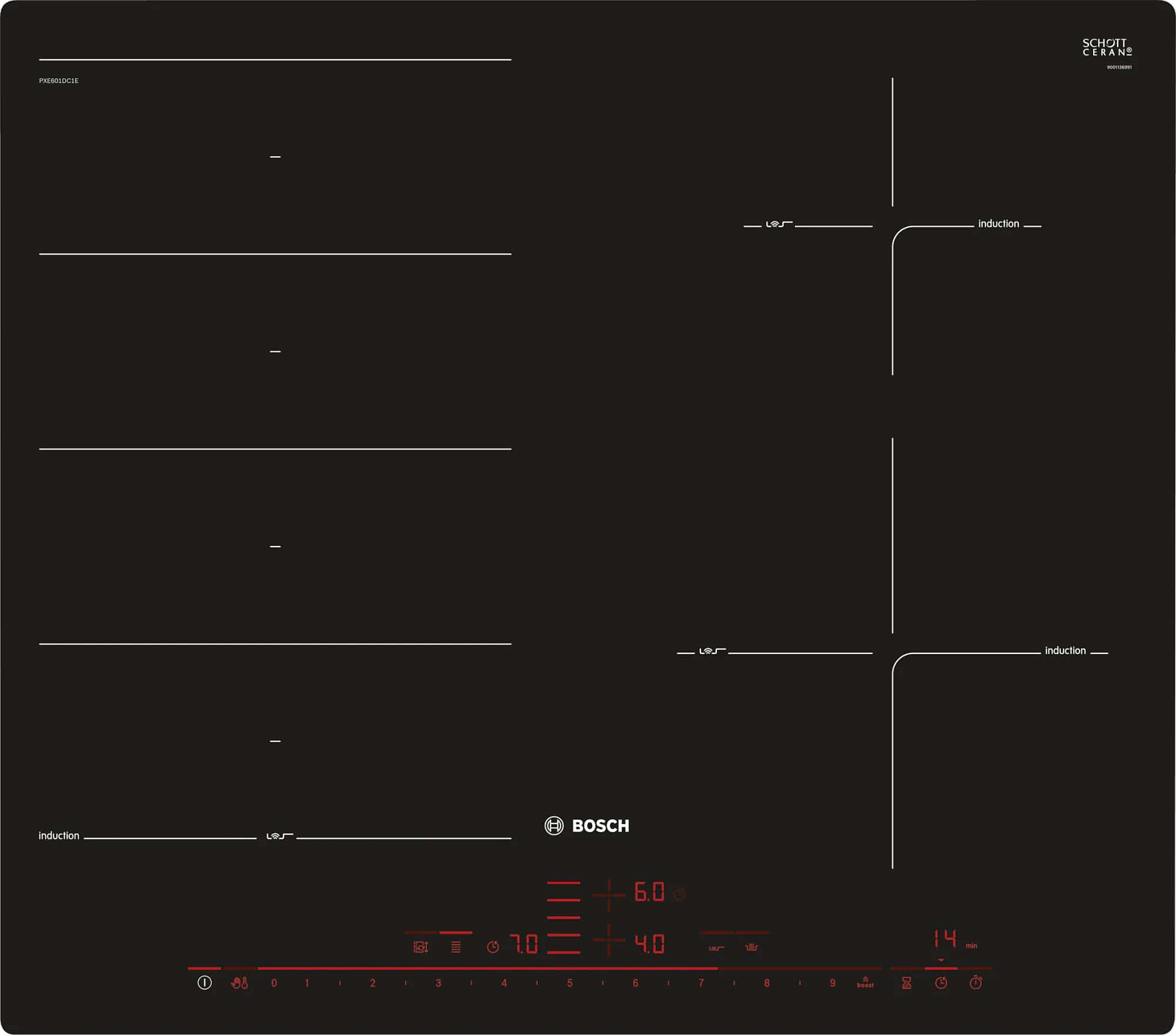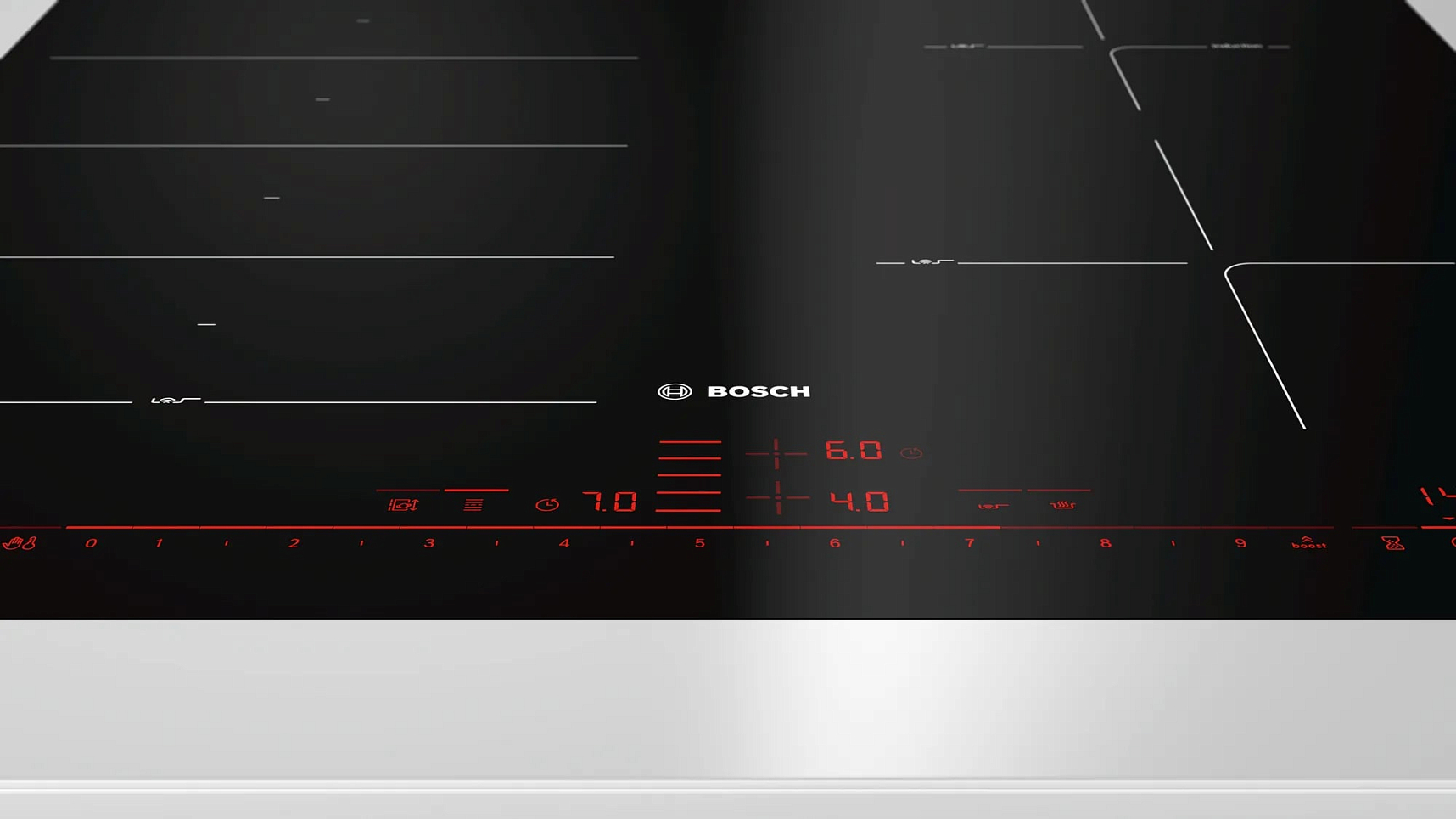 Варочная панель Bosch PXE601DC1E из серии Serie | 8 — это гармоничное сочетание утончённого дизайна и передовых инженерных решений. Её чёрная стеклокерамическая поверхность с прямым краем идеально встраивается вровень со столешницей, создавая визуальную целостность и упрощая уход за кухонной зоной. Такой минималистичный подход органично дополняет как современные, так и классические интерьеры, добавляя им лаконичный, но выразительный акцент.