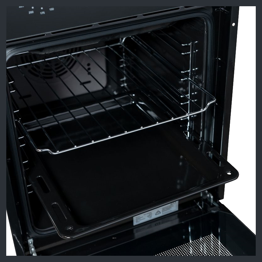 Духовой шкаф оборудован утапливаемыми переключателями, обеспечивающими удобство эксплуатации и эстетичный внешний вид. В комплект поставки входят универсальный противень и хромированная решетка, расширяющие возможности приготовления.
