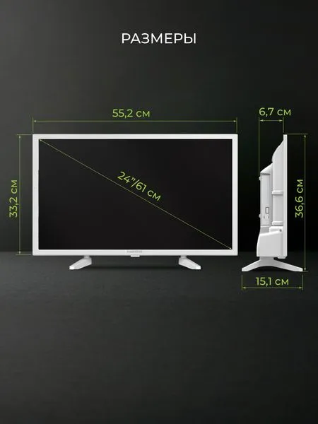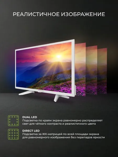 24-дюймовый (примерно 61 см) Smart TV с HD-разрешением (1366x768), IPS-матрицей, белым корпусом, операционной системой YaOS и встроенным Wi-Fi, предлагающий просмотр цифрового ТВ (DVB-T/T2/C/S/S2), медиаплеер, Bluetooth для подключения устройств и функции Smart TV для онлайн-контента, а также VESA крепление 100x100мм